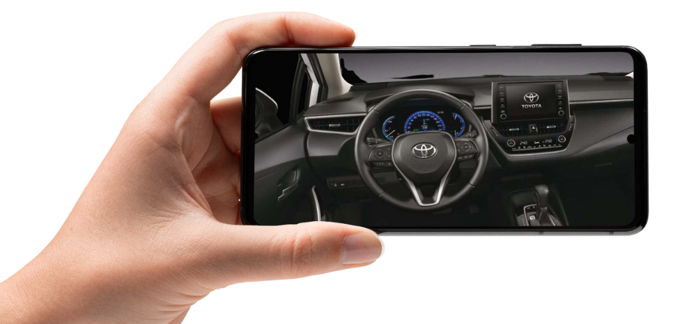 Tome una fotografía panorámica del interior mostrando el volante, que abarque el radio y la palanca de cambios.